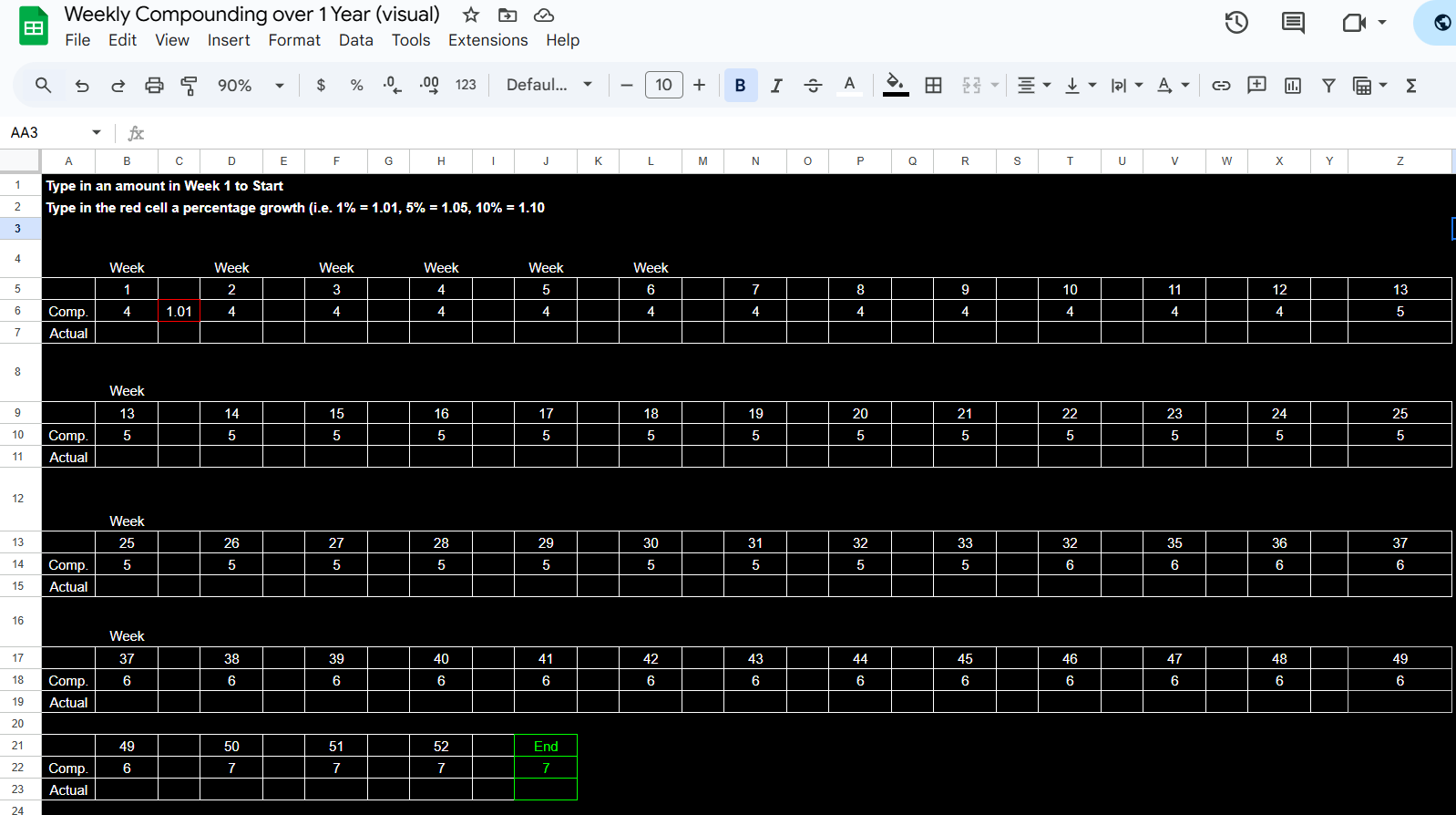 I find that most people start something new and then shift because they can’t see the results quickly. I created this sheet to answer a question. If I could only get 1% better each week, what would that look like over a year.