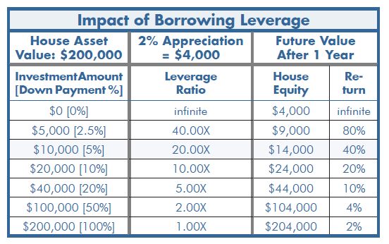 If you buy a home with 20% down and finance the rest with a mortgage, you're using 5X leverage. Said differently you are using $40,000 to control a $200,000 asset.