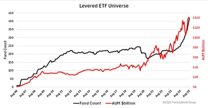 🔺 The red line (AUM) shows that assets under management in leveraged ETFs have exploded since 2022, hitting over $130 billion by mid-2025.